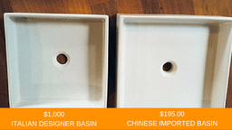 If there’s no hope for your old taps, towel rails and toilet roll holders, then replace but don’t pay full retail. Don’t walk past clearance tables or ignore supplier sales! I’ve picked up the best bargains for my renovation projects by spending time digging through the duds to find the diamonds. Recently, I purchased an entire bathroom of fixtures and fittings for next to nothing. By chatting with the store staff about the products I was after, I discovered they had some ex display items from a discontinued line, they were willing to sell at a heavily discounted rate. Also look for the fake clones, knock-offs of the more luxurious designer brands. A classic example of a designer knock-out. These bathroom basins look not too dissimilar yet have a massive price difference.